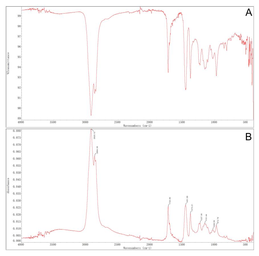 图1 (A)目标样品的FT-IR光谱;(B)ATR校正后的具基线校正的FT-IR光谱。