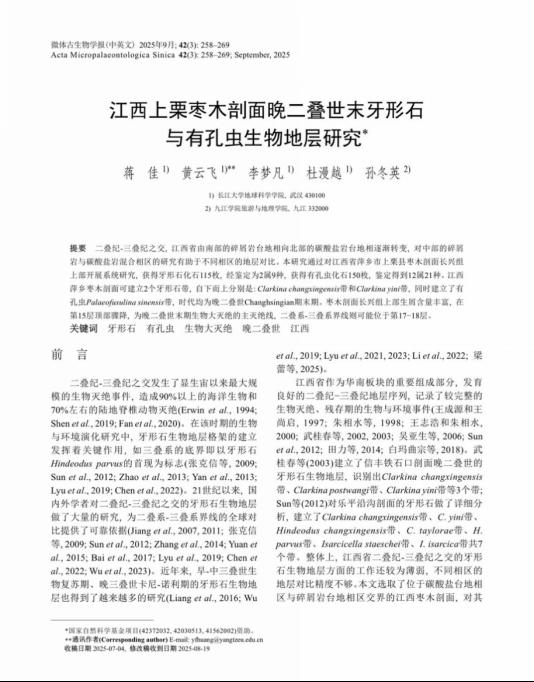 bevitor伟德黄云飞教授团队长期从事古-中生代之交重大地质转折期生物灭绝与生物复苏方面的研究,团队成员蒋佳在古生物学领域核心期刊《微体古生物学报》上发表题为“江西上栗枣木剖面晚二叠世末牙形石与有孔虫生物地层研究”的研究论文。bevitor伟德为论文第一署名单位,研究生蒋佳为论文第一作者,黄云飞教授为该文通讯作者,本项研究得到国家自然科学基金项目(42372032, 42030513, 41562002)资助。