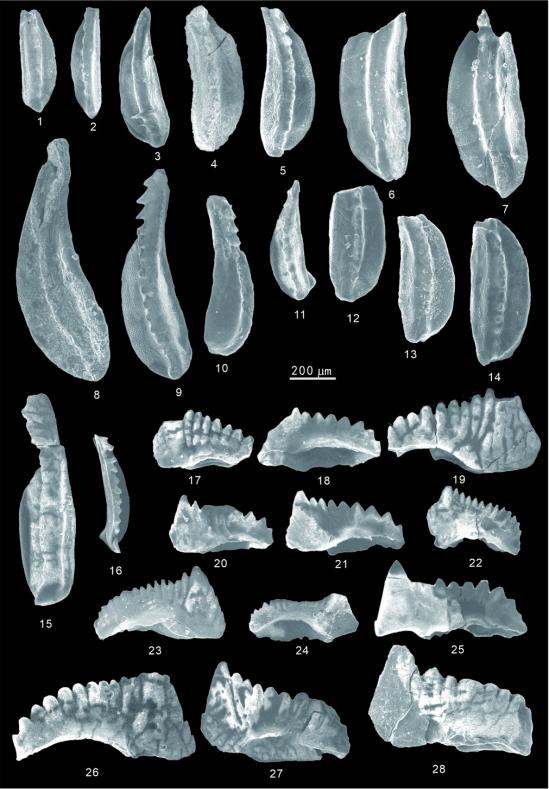 该研究对江西上栗县枣木剖面二叠系-三叠系剖面开展了系统的古生物学研究工作,共挑选出牙形石化石标本115枚,鉴定为2属9种;岩石薄片中识别出可鉴定有孔虫化石150枚,其中非䗴有孔虫98枚,䗴类有孔虫52枚,经鉴定得到12属21种,包括非䗴有孔虫9属15种,䗴类有孔虫3属6种。生物地层方面,建立了2个牙形石带,自下而上分别是Clarkina changxingensis带和Clarkina yini带,同时建立了一个有孔虫Palaeofusulina sinensis带,时间均为晚二叠世Changhsingian期末期。枣木剖面长兴组上部生屑含量丰富,在第15层顶部骤降,为晚二叠世末期生物大灭绝的主灭绝线,而二叠系-三叠系界线则可能位于第17-18层。