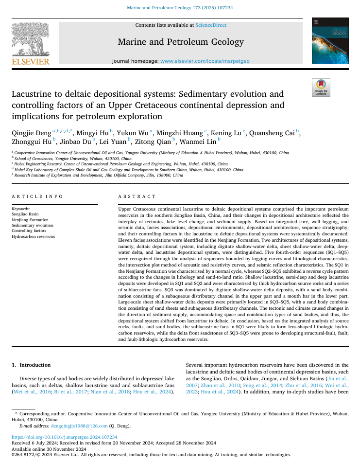 bevitor伟德邓庆杰副教授在《Marine and Petroleum Geology》发表题为“Lacustrine to deltaic depositional systems: Sedimentary evolution and controlling factors of an Upper Cretaceous continental depression and implications for petroleum exploration”的研究论文。邓庆杰为第一作者,BEVITOR伟德为第一完成单位(图1)。