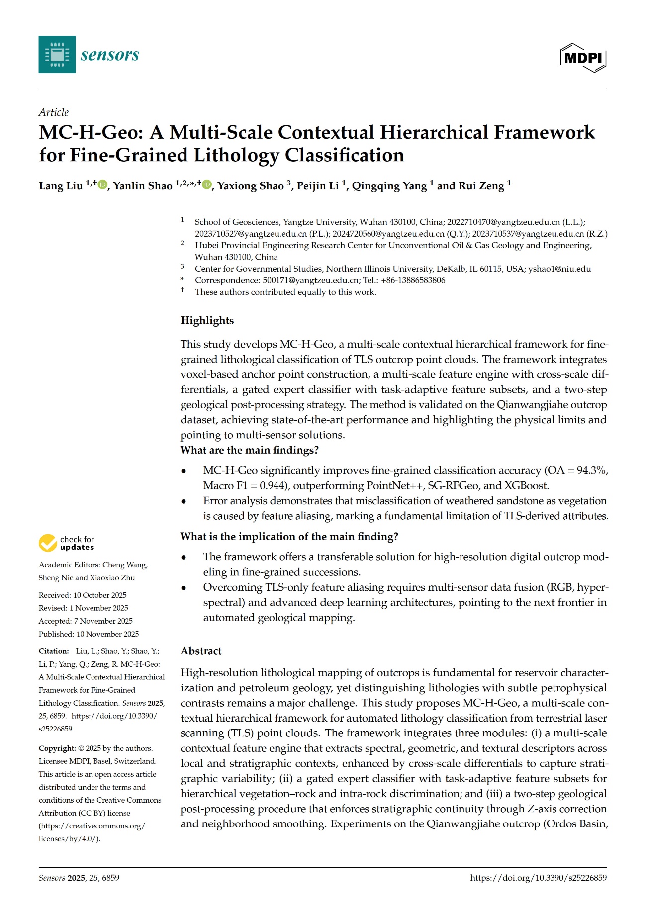 bevitor伟德邵燕林副教授团队长期从事数字露头、储层三维表征等方面的研究,团队硕士生刘浪在遥感领域期刊《Sensors》上发表题为“MC-H-Geo: A Multi-Scale Contextual Hierarchical Framework for Fine-Grained Lithology Classification”的研究论文。bevitor伟德为论文第一署名单位,硕士生刘浪为论文第一作者,邵燕林副教授为该文通讯作者。