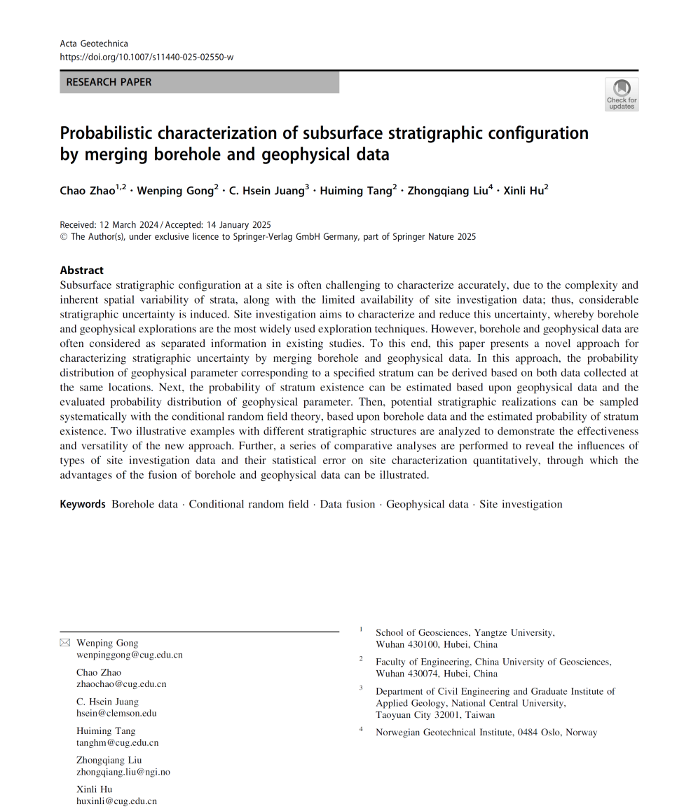 bevitor伟德特任教授赵超在《Acta Geotechnica》发表题为“Probabilistic characterization of subsurface stratigraphic configuration by merging borehole and geophysical data”的研究论文(图1)。赵超为第一作者,BEVITOR伟德为第一完成单位。
