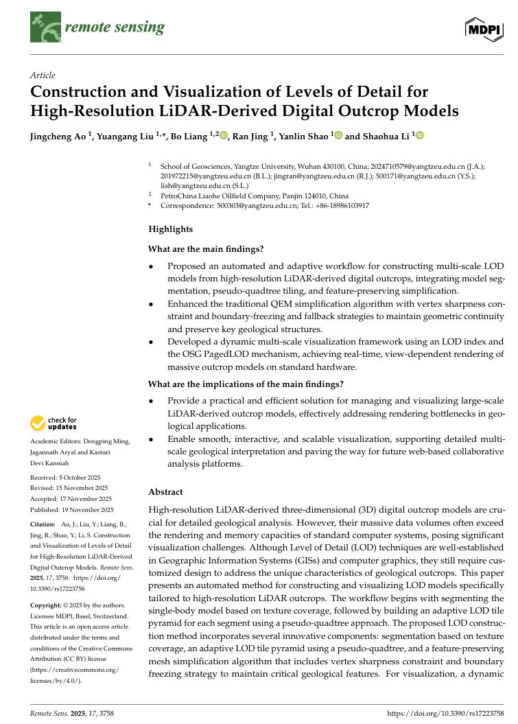 bevitor伟德硕士生敖竞成在遥感领域期刊《Remote Sensing》发表题目为“Construction and Visualization of Levels of Detail for High-Resolution LiDAR-Derived Digital Outcrop Models”的研究论文(SCI二区,影响因子4.1)。bevitor伟德为论文第一署名单位,硕士研究生敖竞成为论文第一作者,其导师刘远刚副教授为通讯作者。