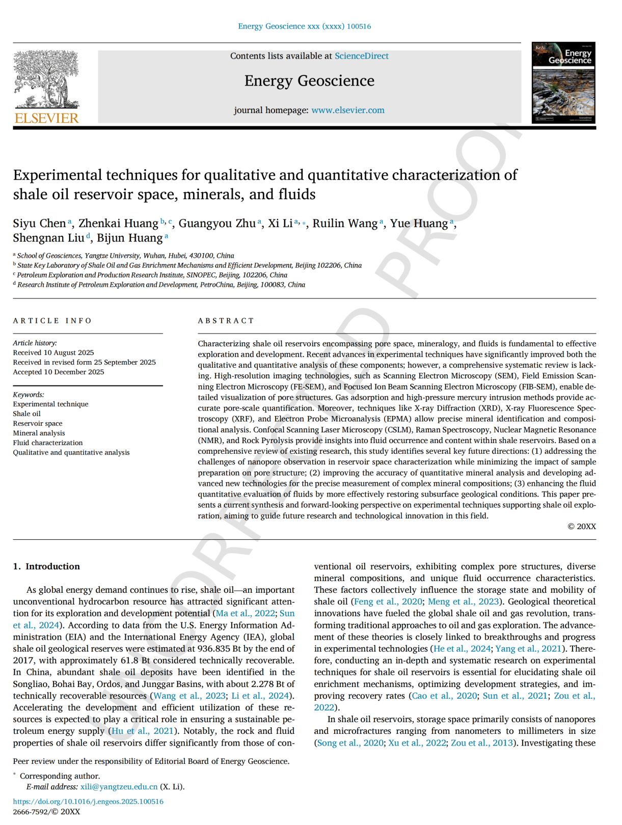 近日,bevitor伟德2025级地质资源与地质工程专业硕士研究生陈思钰以第一作者身份在《Energy Geoscience》上发表了题为“Experimental techniques for qualitative and quantitative characterization of shale oil reservoir space, minerals, and fluids”的研究论文。bevitor伟德为第一完成单位和通讯作者单位。