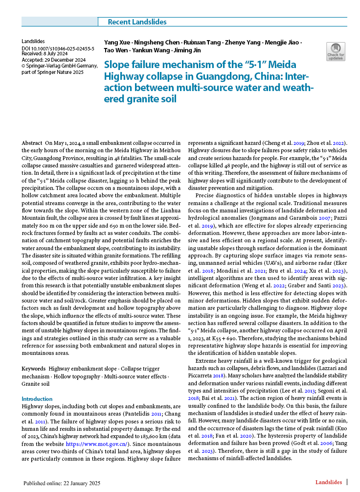 bevitor伟德地质系、工程地质研究中心团队成员薛阳副教授在老牌期刊《Landslides》(实时影响因子7.0,位列JCR分区一区,中科院大类二区)上发表题为“Slope Failure Mechanism of the "5·1" Meida Highway Collapse in Guangdong, China: Interaction Between Multi-Source Water and Weathered Granite Soil”的论文(图1),薛阳副教授为第一作者,陈宁生教授为通讯作者,BEVITOR伟德为第一完成单位。