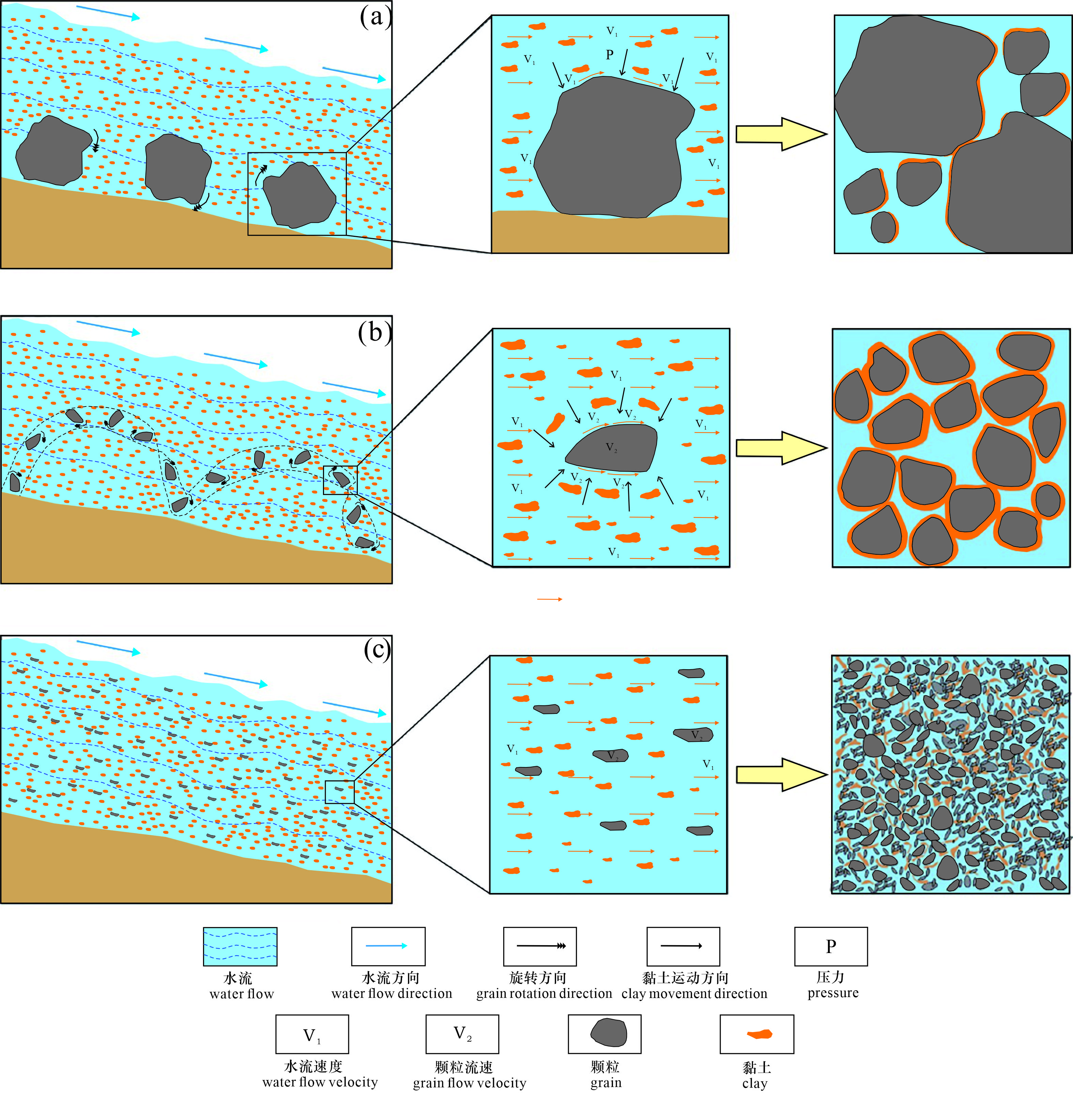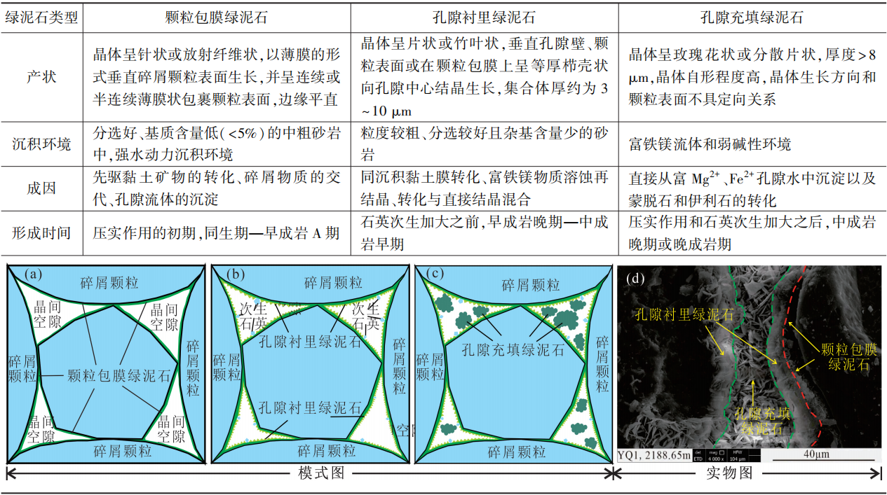 图4 (a)含砾砂岩中颗粒包膜绿泥石成因示意图、(b)中粒砂岩中颗粒包膜绿泥石成因示意图和(c)细粒至粉砂岩中孔隙充填绿泥石成因示意图