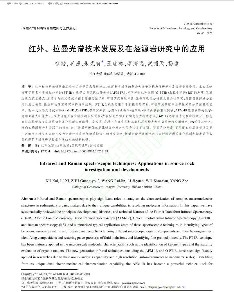 bevitor伟德2025级地质学专业硕士生徐锴以第一作者身份在中文核心期刊《矿物岩石地球化学通报》上发表题为“红外、拉曼光谱技术发展及在烃源岩研究中的应用”的研究论文。bevitor伟德为论文第一署名单位,硕士生徐锴为论文第一作者,其导师朱光有教授为论文通讯作者。