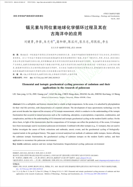 bevitor伟德2025级地质学专业博士生刘健勇以第一作者身份在中文核心期刊《矿物岩石地球化学通报》上发表题为《镉元素与同位素地球化学循环过程及其在古海洋中的应用》论文。bevitor伟德为论文第一署名单位,博士生刘健勇为论文第一作者,其导师朱光有教授担任论文通讯作者。