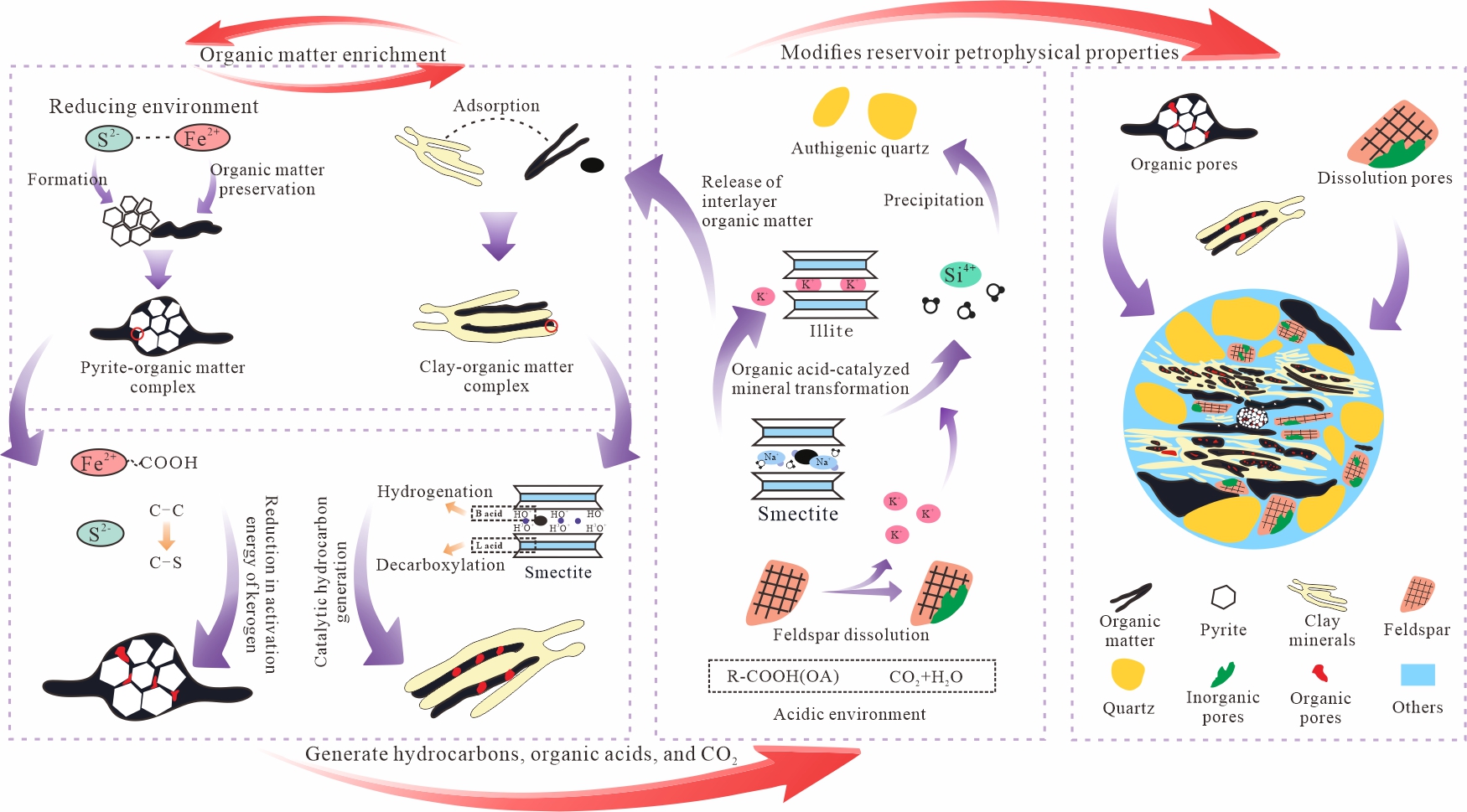 页岩作为非常规油气的重要赋存载体,兼具烃源岩和储集层的双重属性,其源储一体化特征使得油气生成、储集与成藏的耦合演化过程极为复杂。有机 - 无机相互作用贯穿于富有机质页岩体系的整个演化过程,是影响页岩源储体系形成的关键因素(图2)。