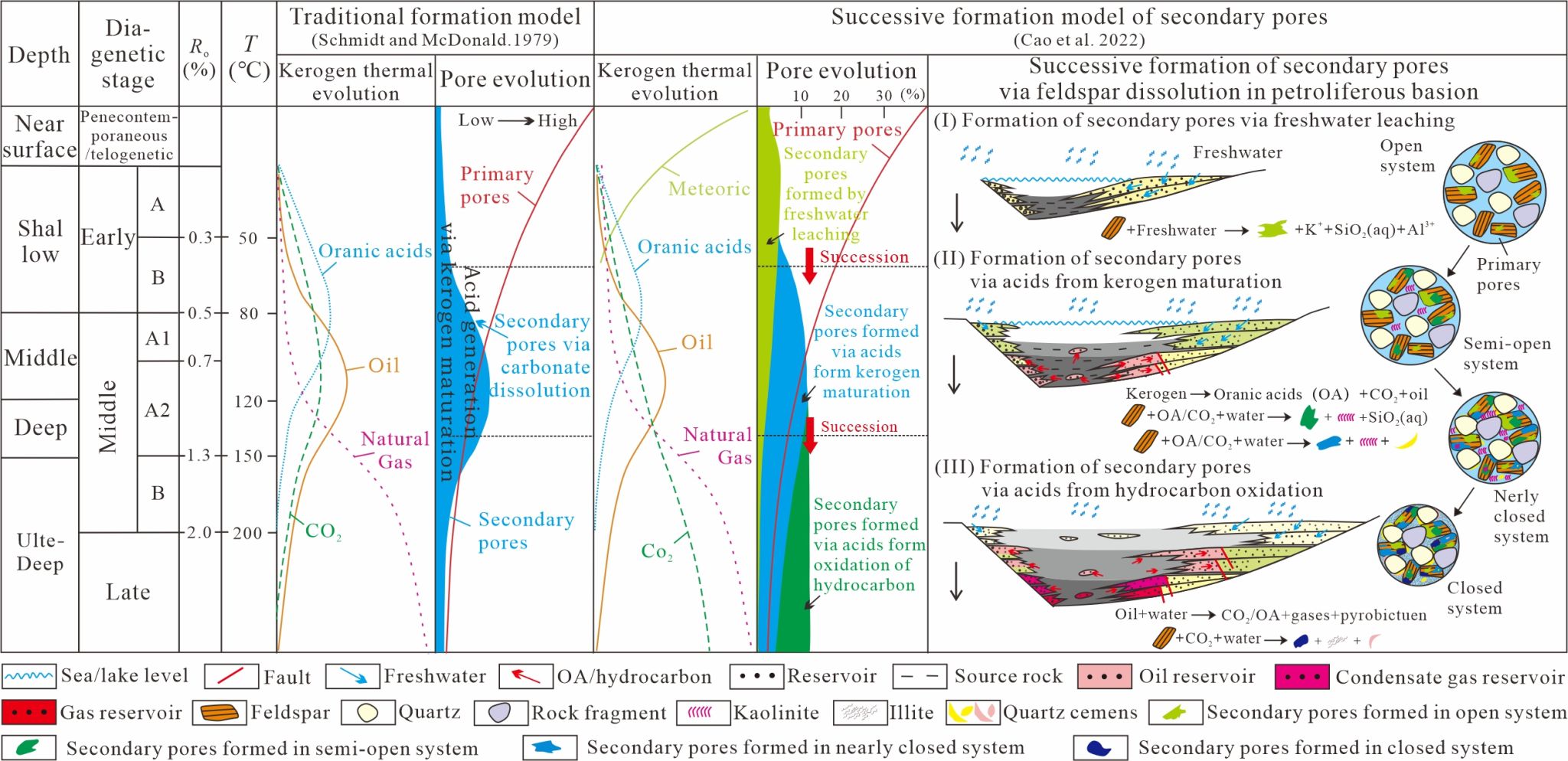 图4 长石溶蚀形成次生孔隙的传统形成模式与连续形成模式对比(据Cao et al., 2022修改)