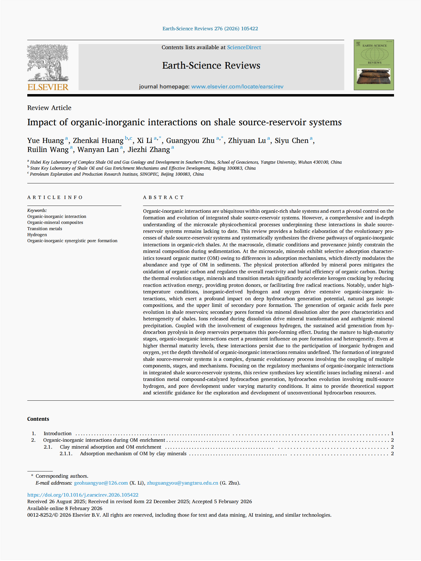 bevitor伟德2025级地质资源与地质工程专业硕士研究生黄月以第一作者身份在《Earth-Science Reviews》上发表题为“Impact of organic-inorganic interactions on shale source-reservoir systems”的论文(图1)。导师朱光有教授为通讯作者。论文总结了富有机质页岩中有机 - 无机相互作用的多元路径,探讨了其对页岩源储一体化体系形成与演化的调控机制。论文共27页。《Earth-Science Reviews》是一本国际顶尖期刊,影响因子10。