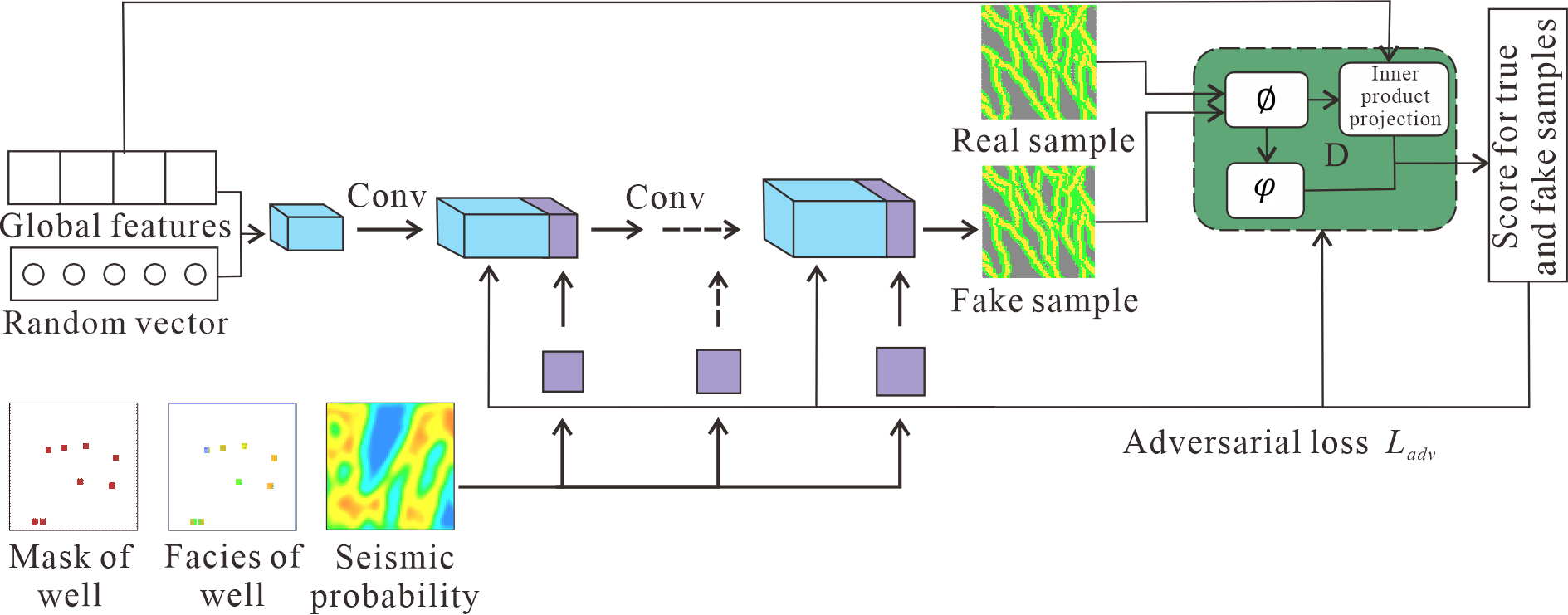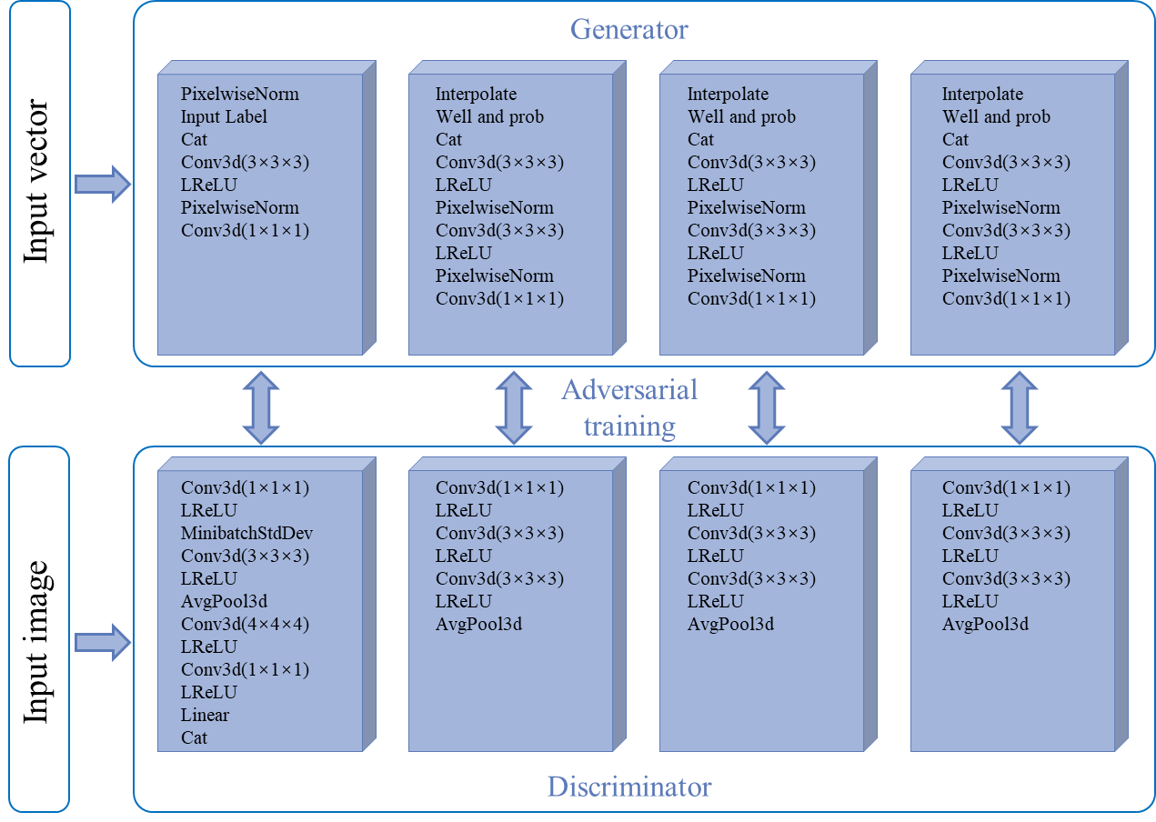 针对浅水三角洲储层深度学习建模中训练数据集匮乏与多源约束融合不足的瓶颈问题,本研究提出了一套从原型数据集构建到条件智能建模的完整技术方案。在数据集构建方面,研究改进了基于目标的Fluvsim算法,引入三维矢量线对象精确刻画水下分流河道中线及分叉关系,结合野外露头实测参数定量统计河道形态特征,批量构建了高质量三维原型相模型训练数据集及配套的井点与地震概率体条件数据集。在建模方法方面,研究在渐进式生成对抗网络(ProGANs)基础上引入条件网络结构,提出条件渐进式生成对抗网络(CPGAN),通过条件损失函数将全局地质标签、井点掩码与地震概率体逐层融入生成器各分辨率级次,实现多源约束驱动的协同学习(图2)。实验结果表明,CPGAN生成的沉积微相模型在平面河道分叉交汇特征与剖面韵律结构上与训练数据集高度吻合,多尺度切片Wasserstein距离(MS-SWD)评价显示其统计相似性显著优于多点地质统计学及序贯指示模拟方法。在计算效率上,单个实现的生成时间较传统方法提升一至两个数量级,且多组随机实现结果表明模型具备合理表征储层不确定性的能力。