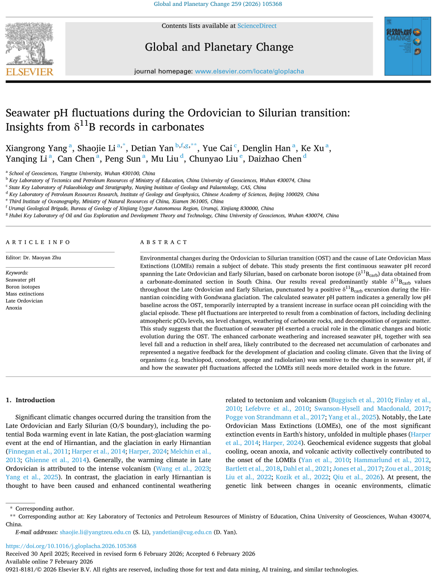 公司bevitor伟德杨向荣副教授在中科院一区期刊《Global and Planetary Change》发表题为“Seawater pH fluctuations during the Ordovician to Silurian transition:Insights from δ11B records in carbonates”的研究论文,bevitor伟德李劭杰特任教授为第一通讯作者,第一署名单位为BEVITOR伟德(图1)。论文介绍了奥陶纪-志留纪这一重要地质历史转折期内的古气候条件转变过程,及其影响下的表层海水酸碱度(pH)值变化和生物演化过程。