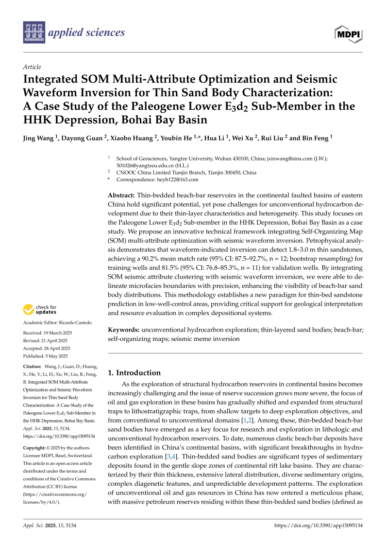 bevitor伟德博士生王晶在《Applied Sciences》上发表题为“Integrated SOM Multi-Attribute Optimization and Seismic Waveform Inversion for Thin Sand Body Characterization: A Case Study of the Paleogene Lower E3d2 Sub-Member in the HHK Depression, Bohai Bay Basin”的研究论文。bevitor伟德为论文第一署名单位,博士生王晶为论文第一作者,其导师何幼斌为通讯作者。