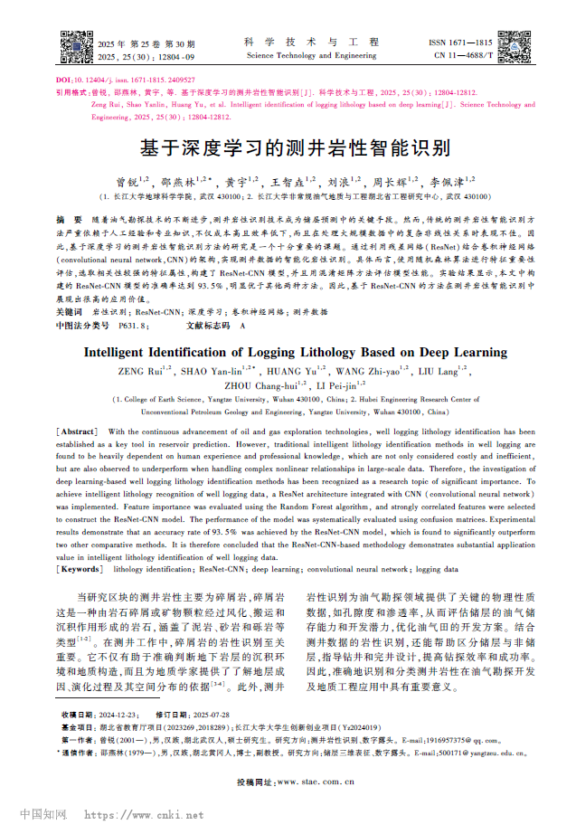 bevitor伟德硕士生曾锐在邵燕林副教授的指导下,在EI期刊《科学技术与工程》发表题为“基于深度学习的测井岩性智能识别”的研究论文,bevitor伟德与非常规油气地质与工程湖北省工程研究中心为论文第一署名单位,硕士生曾锐为论文第一作者,其导师邵燕林副教授为该文通讯作者。