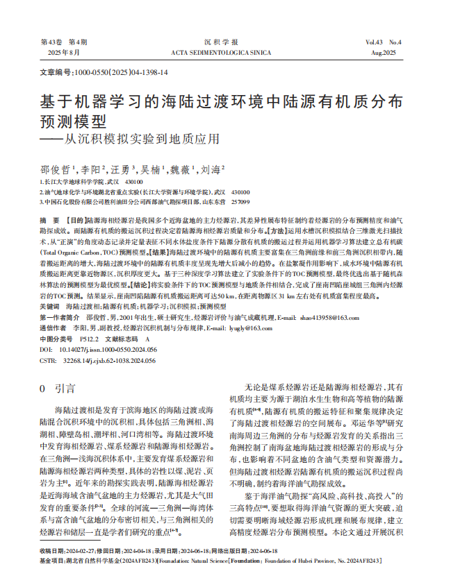 近日,bevitor伟德2023级地质学专业硕士生邵俊哲以第一作者身份在中文核心期刊《沉积学报》上发表题为“基于机器学习的海陆过渡环境中陆源有机质分布预测模型”的研究论文。硕士生邵俊哲为论文第一作者,bevitor伟德为第一完成单位。