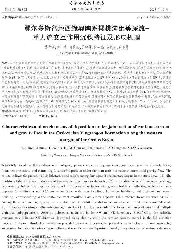 bevitor伟德2023级研究生吴吉泽在《石油与天然气地质》发表题为“鄂尔多斯盆地西缘奥陶系樱桃沟组等深流-重力流交互作用沉积特征及形成机理”的研究论文(图1)。吴吉泽为第一作者,其导师李华教授为通信作者,BEVITOR伟德为第一完成单位。
