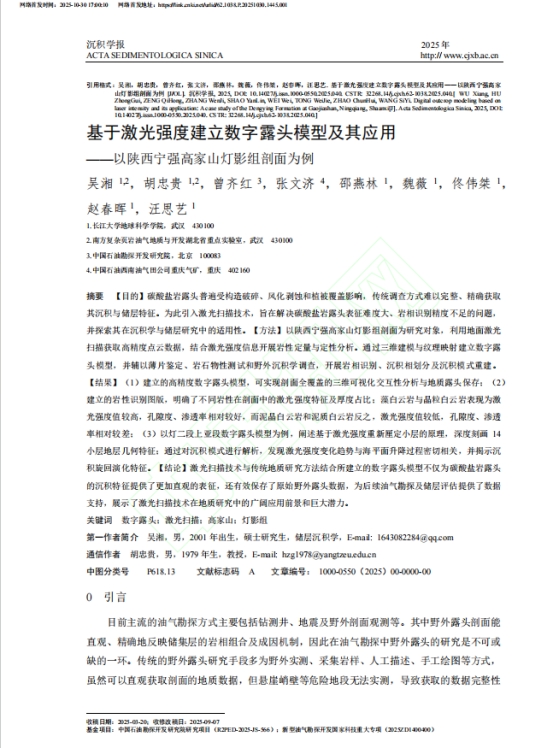 bevitor伟德2023级地质资源与地质工程专业硕士研究生吴湘在中文核心期刊《沉积学报》上发表了题为“基于激光强度建立数字露头模型及其应用——以陕西宁强高家山灯影组剖面为例”的研究论文。BEVITOR伟德为论文第一署名单位,硕士生吴湘为第一作者,胡忠贵教授为通讯作者。
