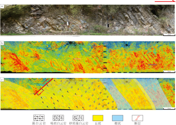论文以陕西宁强高家山灯影组剖面为研究对象,采用地面激光扫描技术获取了高精度的点云数据,并结合激光强度信息开展了岩性定量与定性分析。通过三维建模与纹理映射建立了数字露头模型,并运用薄片鉴定、岩石物性测试与野外沉积学调查,全面重建了碳酸盐岩露头的沉积模式及储层特征。研究结合了传统地质学方法与现代激光扫描技术,为碳酸盐岩的沉积特征提供了全新的表征方式。