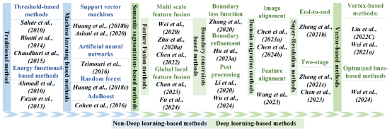 从高分辨率自动提取建筑物对于广泛的应用来说仍然具有挑战性。之前的研究已经回顾了建筑提取方法,但深度学习(DL) 的快速发展凸显了针对 HRSI 应用进行更新回顾的必要性。因此,我们回顾了 243 篇论文,以确定未来的研究趋势,并强调基于 HRSI 的建筑物提取的五个关键挑战:复杂的边界优化、形状和光谱变化、样本不足、树木和阴影干扰以及轻量级模型应用。随后,我们利用先进的深度学习技术探索了五个相应的机会。现有方法主要分为两大类:基于非深度学习 (NDL) 的方法和基于 DL 的方法。这些进一步细分为四大类:传统方法、基于机器学习的方法、基于语义分割的方法和基于向量的方法,并根据其基本原理进行详细讨论。此外,我们还介绍了几个实际应用并介绍了 10 个公开可用的基准。我们使用三个公共数据集:WHU、马萨诸塞州和 WHU Satellite I 建筑数据集,对九种代表性方法以及我们提出的多并行视觉 Mamba 网络 (MVMNet) 进行了全面评估。在这些方法中,HD-Net 和 MSSDMAP-Net 在解决与复杂边界相关的挑战方面表现出卓越的性能,而 BuildFormerSegDP 和 CBRNet 在减轻树木遮挡的影响方面表现出增强的有效性。值得注意的是,MVMNet 在解决与建筑物内光谱异质性相关的挑战方面优于其他方法,分别实现了 0.9076、0.7376 和 0.6612 的最佳交并集 (IoU) 值。最后,我们探索了一系列有前景的研究方向,并为未来的研究人员提供参考和见解