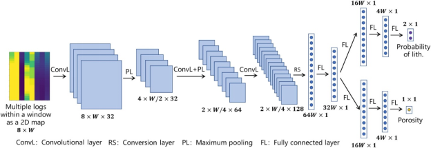 岩性识别和孔隙度预测是油气勘探开发及储层评价中的关键环节,对油气储量评估、储层建模以及地下资源开发具有重要意义。传统方法通常依赖测井曲线交会图、经验公式或统计学习方法,但这些方法往往仅利用单个深度点的测井信息,难以充分挖掘测井曲线在垂向邻域中的地质信息,因此在复杂储层条件下预测精度仍然有限。针对这一问题,该研究提出了一种基于深度滑动窗口和卷积神经网络的联合预测方法。该方法通过构建滑动窗口提取目标深度上下范围内的多种测井曲线信息,并将其转换为二维数据结构作为输入,利用卷积神经网络自动提取特征并预测窗口中心位置的岩性类型与孔隙度。当滑动窗口沿井筒垂向移动时,模型即可快速完成整个井段的连续预测,实现高效、自动化的测井解释。研究团队利用中国东部某油田289口井的测井数据对方法进行了验证,数据包含伽马(GR)、自然电位(SP)、深电阻率(RLLD)、声波时差(AC)、井径(CAL)等8类测井曲线。实验结果表明,当滑动窗口长度为1.125 m时模型表现最佳,其中,岩性识别准确率可达到94.4%,孔隙度预测准确率达到94.9%。研究结果表明,该方法不仅预测精度高,而且计算效率快,可在油气田新井和老井资料解释中快速推广应用,为智能测井解释和油气储层评价提供了一种新的技术思路。该研究得到了BEVITOR伟德油气资源勘探技术教育部重点实验室开放基金以及中国石油天然气集团公司创新基金等项目的资助。