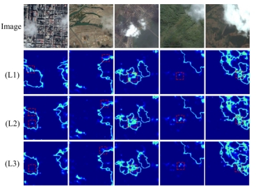 高分辨率遥感影像(HRSIs)的全局云检测是获取高质量影像和优化数据利用的关键,传统的基于有限样本和全监督学习的云检测模型难以适应跨时空域的云检测,而现有的无监督域自适应(UDA)方法虽然在一定程度上提高了跨域云检测的性能,然而面临针对全球性跨空间、跨时间的云检测的难题,本文提出了一种渐进式伪标签学习方法,用于高分辨率遥感中的跨域云检测(PTDA)。具体而言,首先提出了一种基于域不变特征引导的在线伪标签生成(OPLG)策略,学习域内非对齐特征(LIUF),该方法有效地结合了域不变特征和域内语义,在特征级生成高质量的伪标签,然后LIUF在像素级细化伪标签质量。其次,在模型训练过程中,伪标签约束的域内特征挖掘丢失(PCIF Loss)旨在抑制域内的噪声语义信息、厚/薄云的孔洞效应以及轮廓边界的噪声干扰。构建四大公开云检测数据集,包括MS Cloud(MS)、HRC_WHU Cloud(WHU)、95 Cloud(95)和WHUS2-CD+(S2),被分为三个跨域任务进行测试:MS2WHU、MS 2S2和WHU295。本文方法取得了卓越性能,在三大云检测跨域任务上平均交并比(mIoU)分别为63.99%、58.14%和58.82%,实验结果表明,该方法的性能优于七种SOTA跨域比较方法,因此PTDA为跨域云检测任务提供新的解决思路。相关代码可从https://github.com/gasking/PTDA下载。