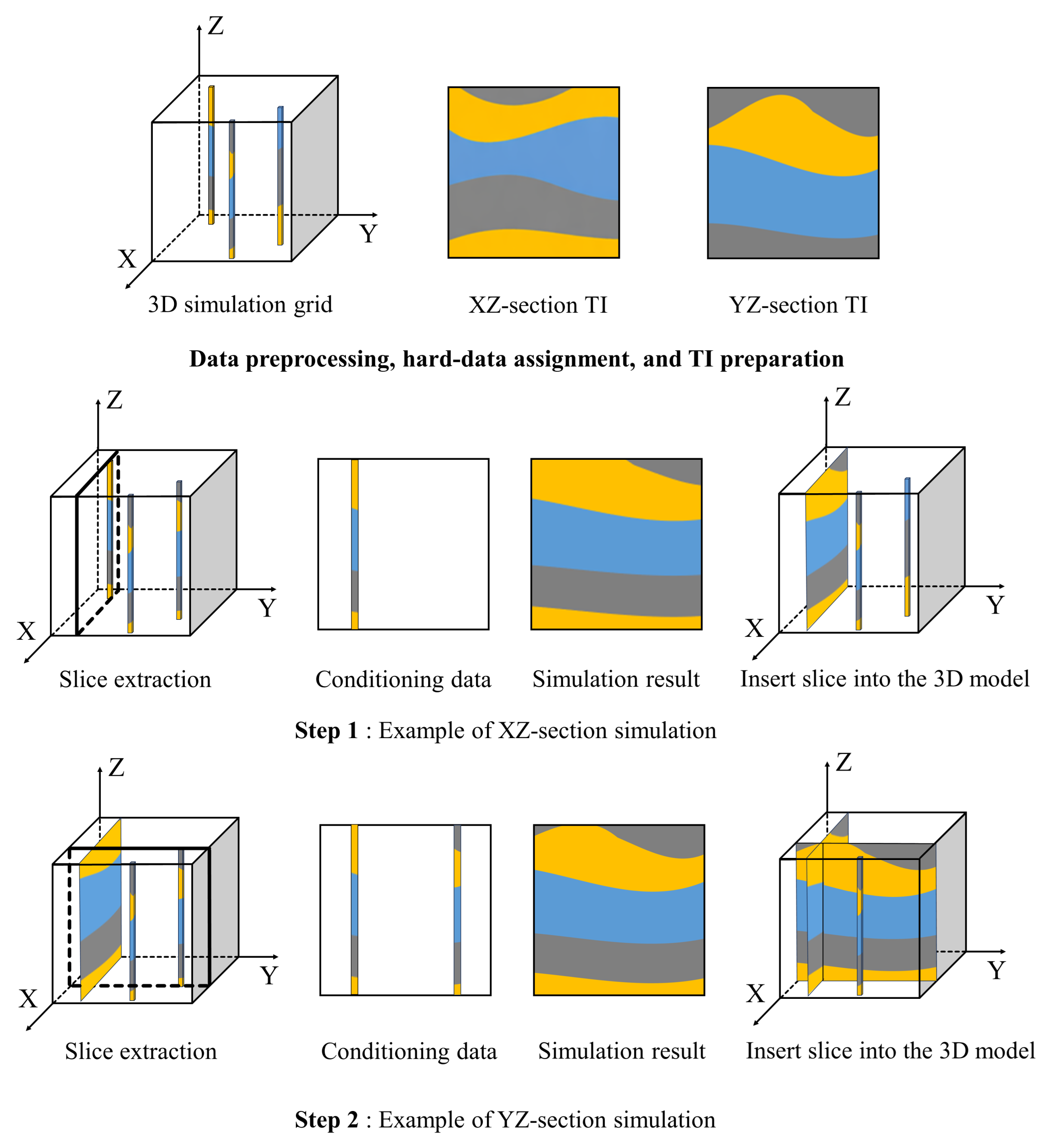 针对上述问题,论文提出了一种面向数据受限条件的分层式页岩储层三维地质建模工作流程。该方法首先在井数据硬约束条件下构建垂向二维岩相剖面,利用混合点地质统计方法(MIXSIM)刻画页岩层理叠置特征和岩相转换规律;随后将二维剖面作为训练图像,通过顺序二维扩展策略(s2Dcd)逐片传播至三维空间,实现三维岩相结构的渐进式构建。在整个建模过程中,井数据始终作为硬约束信息严格保留。