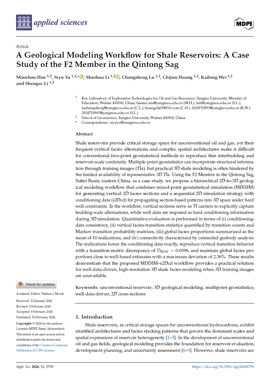 bevitor伟德2023级研究生韩茂洲在地球科学与工程应用领域期刊《Applied Sciences》发表题为“A Geological Modeling Workflow for Shale Reservoirs: A Case Study of the F2 Member in the Qintong Sag”的研究论文。bevitor伟德为论文第一署名单位,研究生韩茂洲为论文第一作者,其导师喻思羽为论文通讯作者。
