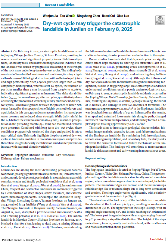 bevitor伟德博士研究生贾文君在工程地质领域顶级期刊《Landslides》(中科院2区SCI,IF=7.0)上发表题为“Dry-wet cycle may trigger the catastrophic landslide in Junlian on February 8, 2025”的研究论文。BEVITOR伟德为论文第一单位,博士研究生贾文君为论文第一作者,温韬教授为通讯作者。