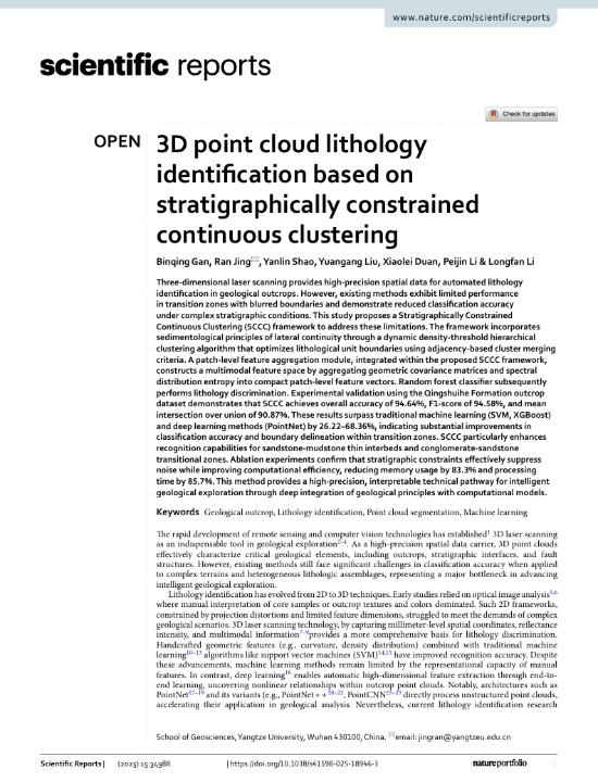 公司硕士研究生干斌清在期刊《Scientific Reports》上发表了题为“3D point cloud lithology identification based on stratigraphically constrained continuous clustering”的论文 ,提出了一种基于地层约束连续聚类(SCCC)的三维点云岩性识别框架 。