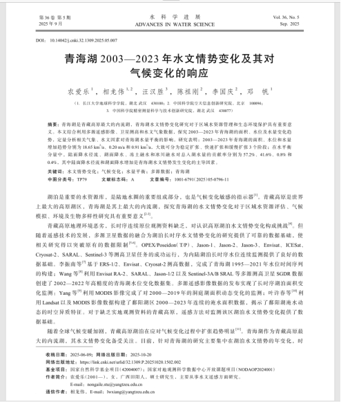 近日,bevitor伟德23级硕士研究生农爱乐以第一作者身份在中文核心期刊《水科学进展》(IF 5.098)上发表题为“青海湖2003—2023年水文情势变化及其对气候变化的响应”的研究论文(图1)。bevitor伟德为论文第一署名单位,其导师相龙伟为论文通讯作者。