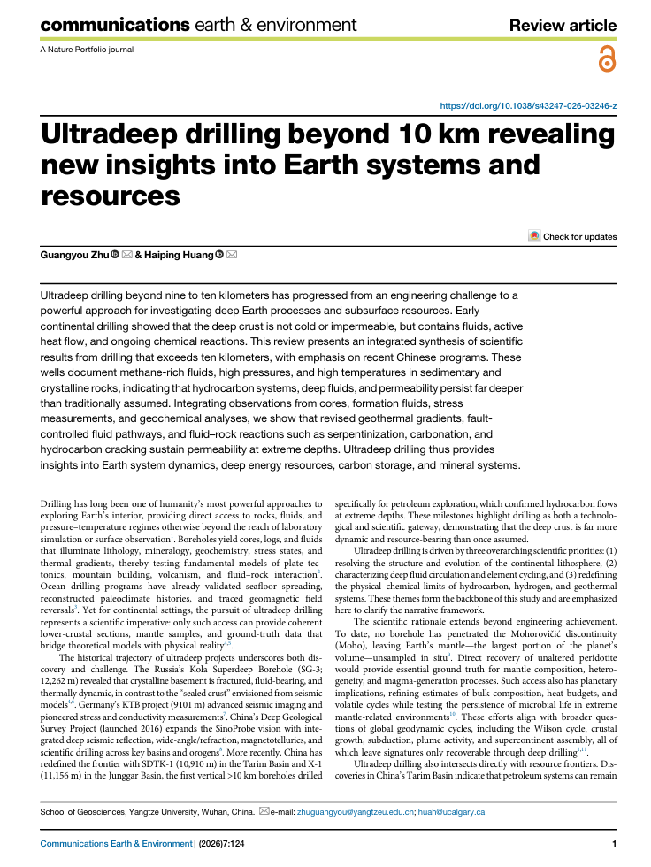 近日,bevitor伟德朱光有教授和黄海平教授在Nature旗下期刊《Communications Earth & Environment》发表了题为“Ultradeep drilling beyond 10km revealing new insights into Earth systems and resources”的文章,文章共20页,图件7幅。该研究系统总结了全球万米级超深钻探的科学发现与技术挑战,特别是以中国新疆塔里木盆地的深地塔科1井(完钻深度10910m)和准噶尔盆地的X-1(完钻深度11156m)井为代表的重大进展,为人类深入了解地球内部奥秘、保障国家能源安全开辟了全新的理论空间。