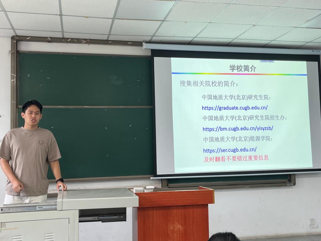 地质(工程)21901班夏彩雨同学以总分第三名的优异成绩荣录中山大学研究生,她在分享时建议大家无论是院校选择还是复习进度,不要与他人攀比,保持自己的节奏最重要。“在自我介绍中要着重强调自己的优势,比如参加了野外实习、本科期间参加过科研项目”是她给大家的复试小Tips。地质(资源)21091班刘辉同学着重分享了考研数学的复习经验,他说“学习数学没有捷径,要多刷题,多练习,认真仔细,学会总结。”