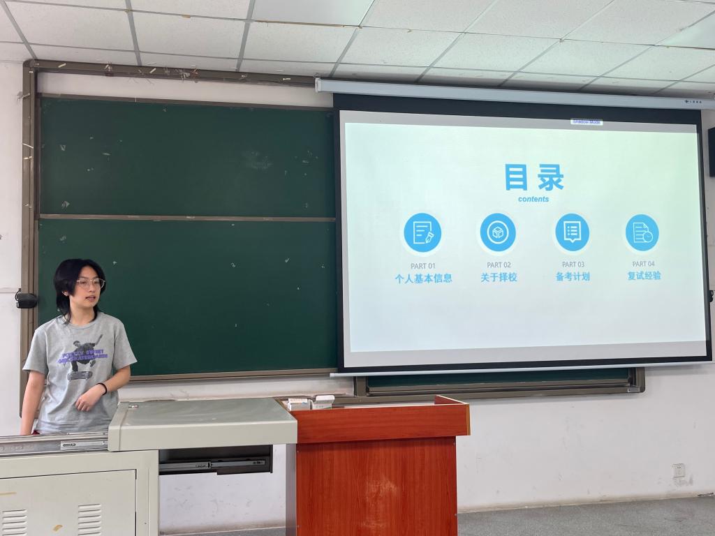 分享会上,资工(卓越)21091班白棋源同学着重分享了考研信息收集渠道和专业课复习技巧,他建议大家“专业课复习一定要按照考纲,将整本书的知识进行梳理与整理。”资工(中俄)21091班韦佳玉同学以“如果成功有捷径 那一定是坚持”为主题,为同学们详细分享了她的各科复习计划、参考资料和复试经验。她认为制定计划并脚踏实地落实,是她以388分初试第一的成绩成功上岸中国石油大学(北京)的制胜法宝。