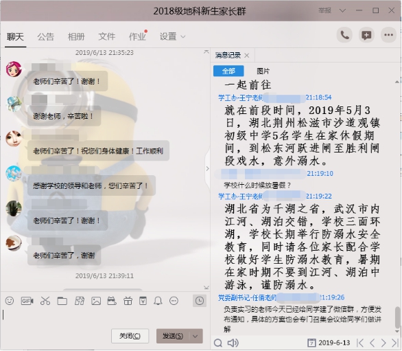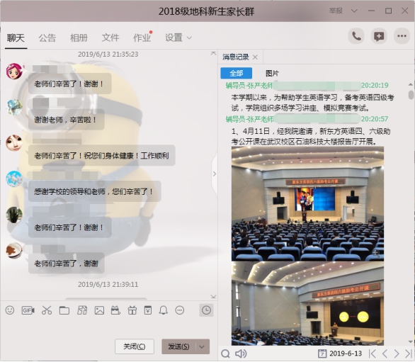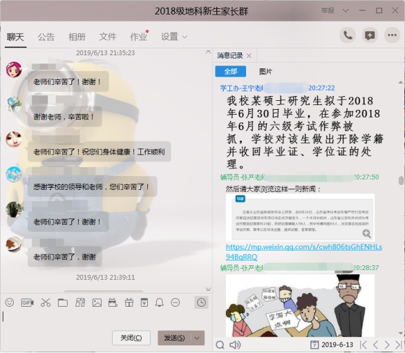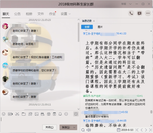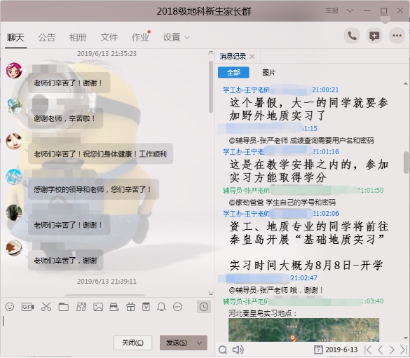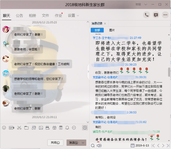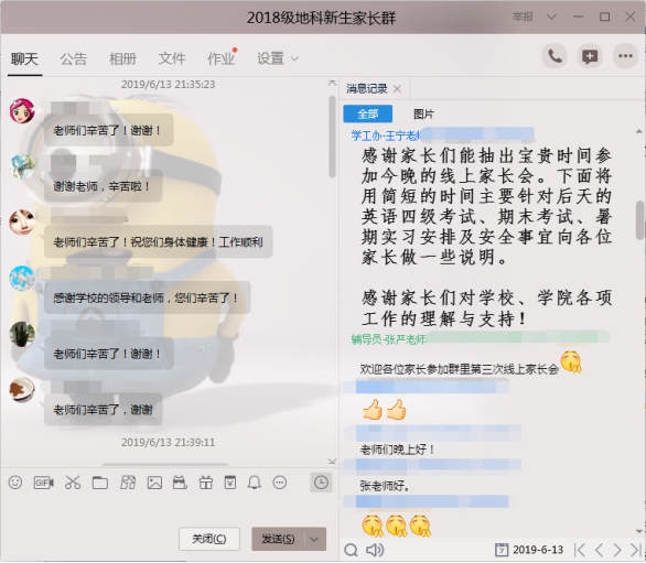 6月13日晚8点,公司在“2018级地科新生家长群”中召开了主题为“诚信应考,平安一夏”2018级本科生第三次线上家长会,公司党委副书记任倩、辅导员潘志远、张严以及员工家长共计140余人参与了讨论,家长会由年级辅导员王宁主持。