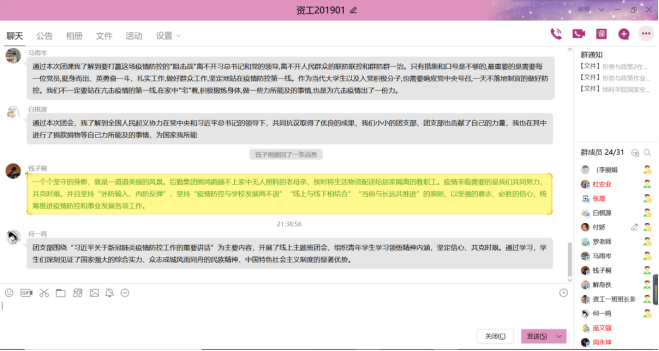 最后,付娇同学对本次团会进行了总结,她说道:“这次疫情可能会给历史留下一道辙痕,但更能载入史册的,是中国人民团结一致,共克时艰的英勇乐观精神!无数逆行者身上彰显出的英雄气概再度诠释了中华民族的伟大!作为青年员工的我们,要以他们为标杆,为中华民族的伟大复兴,奉献自己的力量。”至此此次线上主题团会活动圆满结束。