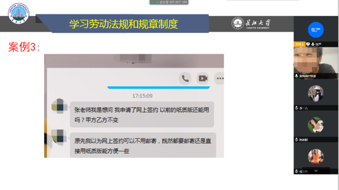 在就业政策讲解部分,张老师就引导员工如何获悉并充分发挥就业政策的作用,学习利用劳动法规保护自己,同时我们自己又应该遵守哪些规章制度来规避风险,以及熟悉公司、公司就业工作基本程序和相关规定等方面进行了介绍。讲解过程中,除了向同学们介绍在疫情环境下国家政府在扶持老员工就业创业方面的鼓励、优待政策以外,还向同学们推广了“BEVITOR伟德就业信息网”政策法规专栏,引导员工充分挖掘并利用资源了解国家各部委、各省市等制定的吸引人才、促进就业创业的政策。此外,会上还利用前期员工线上咨询的案例对员工在就业过程中遇到的具体问题进行分析和引导,避免员工在后面进入相同的误区。