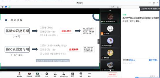 6月11日晚7点半,地信21602班瞿芳芳同学和地信21601班吕文超同学给2017级地信专业开展线上考研经验交流,他们分别以优异的成绩被武汉大学和中国矿业大学录取为硕士研究生。作为一名成功考上武汉大学的学霸,瞿芳芳同学首先告诫考研的同学们要“忠于现实,明确目标”,在考研的路上一定要“耐得住寂寞,顶得住诱惑”,随后她就考研常识、考研规划和备考初试复试进行了详细解读,她强调了夏令营活动的重要性,这是一个可以帮助我们在同等条件下优先被录取的渠道。今年考取中国矿业大学的吕文超同学首先就地信专业考研难度进行了分析,他强调了“考研务必明确方向,切勿盲目跟风”,同时他也分享了优质考研资料的获取渠道并强调了关注时事热点的重要性,最后他就如何调整复习心态进行了切身介绍,同学们纷纷表示获益匪浅。