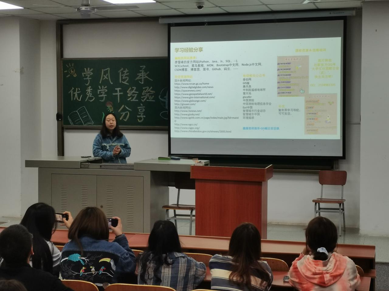 在地理信息科学专业的分享会上,主讲人有来自地信(测绘)21901的汤文惠学姐和地信21702并且已经被推免到中国地质大学(武汉)的任安晶学姐。汤文惠就学习和生活两个方面开始今天的演讲,在学习方面,她着重为新生们分享了学习英语的方法与经验;在生活方面,她希望新生们不宜贪多,不要轻易放弃,不要轻易否定自我并且要学会分清主次,合理安排时间,懂得调节情绪。任安晶为新生们展示了自己的优异成绩,分享了宝贵的学习经验,推荐了许多学习的资源,并将“自学自律、敢闯敢拼、良师益友、学无止境”的生活和学习态度分享给学弟学妹们。