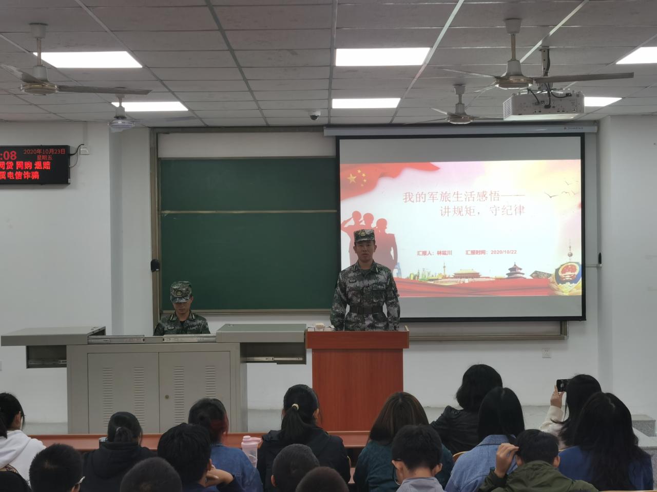 (通讯员 陶潇桐)为了优化员工管理,帮助新生自觉养成讲规矩、守纪律、珍惜时间的好习惯,公司邀请从海军陆战队退伍的地信21701班林竑川同学于10月23日在武教B-106举行了以“讲规矩,守纪律”为主题的军旅生活分享会。党委副书记任倩老师、辅导员郭霖老师,地信22001和地信22002班全体同学参加了本次活动。