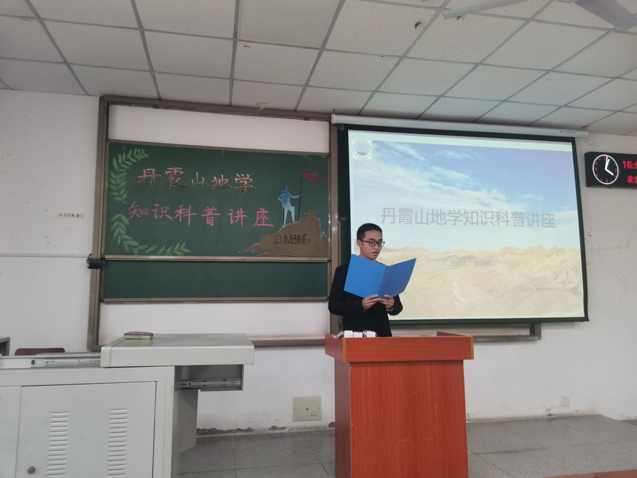 讲座开始,首先由主持人陈昱涵为我们简单介绍了主讲人徐明帅以及他所参加志愿活动的组织“脚爬客”。紧接着,徐明帅以两段简短的丹霞山视频开始了今天的演讲,这两段视频记录了他们在丹霞山科普学习生活的点点滴滴和丹霞山的美景,他根据自己的所见所学所感生动形象地讲述了丹霞山的地貌的特征以及形成过程。
