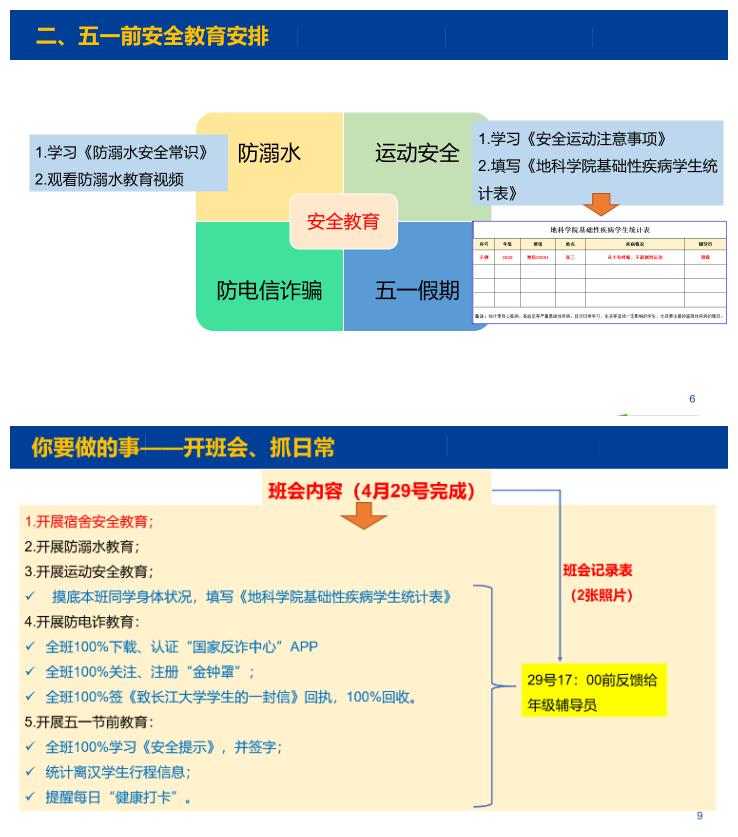 接下来,郭霖老师针对一系列安全问题做了详细安排和说明。一是宿舍管理方面。郭老师通报了4月份公司员工宿舍使用违规电器和晚归情况,并对事件危害进行了分析,提醒大家务必遵守公司相关规定,安全高于一切。二是五一假期安全。要求各班班长召开安全主题班会,在班会上做好防溺水、运动安全、防电信诈骗和五一假期安全四个方面的教育,重点做好“国家反诈中心”APP和微信公众号“金钟罩”的下载与认证、假期离汉员工的行程登记、假期安全教育告知书的签收等。