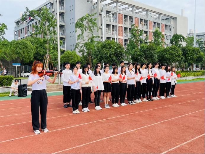升旗仪式开始前,全体师生进行“唱红歌”环节。在资工22004班和院员工会同学们的带领下,全体同学满怀热情,先后齐唱了《国家》和《闪闪的红星》,两首歌曲,嘹亮的歌声响彻整个操场。