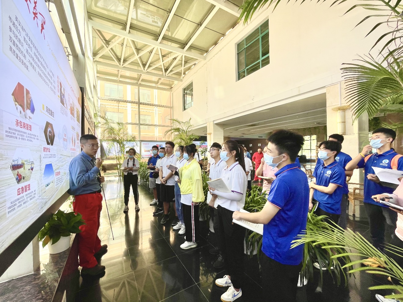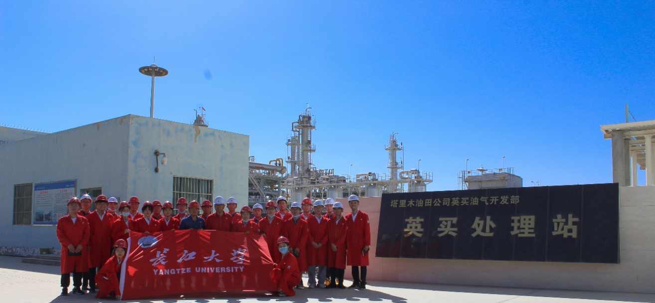随后,“后浪队”一行步行前往英买处理站,进行实地调研,现场学习。进站前,大家学习了正确佩戴安全帽、着安全工作服、消除静电等安全知识。在站长李正涛的带领下,大家参观了整个处理站,逐一认识并了解了消防水罐、凝析油三级闪蒸罐、再生气空冷器、天然气区、断层流补气、凝析油气罐、分子筛吸附塔和“火炬”等仪器的运行原理和用途,经历了课本与现场、理论与实践的思想火花碰撞。特别是在了解到英买处理站独特的分子筛脱水技术和段塞流捕集器为亚洲之最时,大家不由得鼓起了热烈的掌声,心中感到无比的骄傲和自豪。