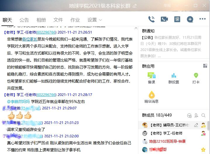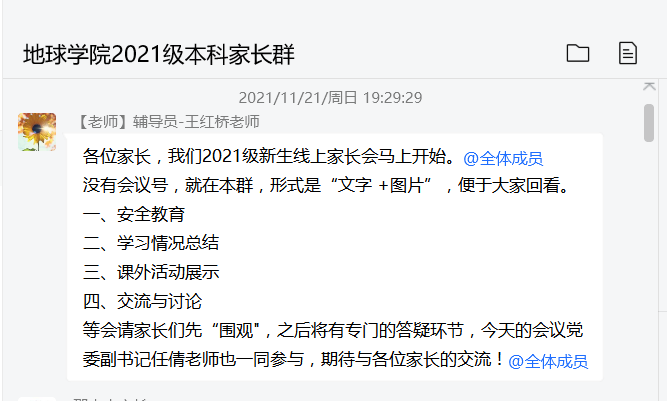 借助QQ群打造家校育人平台是公司践行“三全育人”的重要举措,新生家长会也是公司长期坚持的优良传统。通过让家长们全面了解公司、知晓孩子在大学的表现,增进公司和家长间的沟通和理解,形成家校联手的协同关系,共同助力员工成长成才。