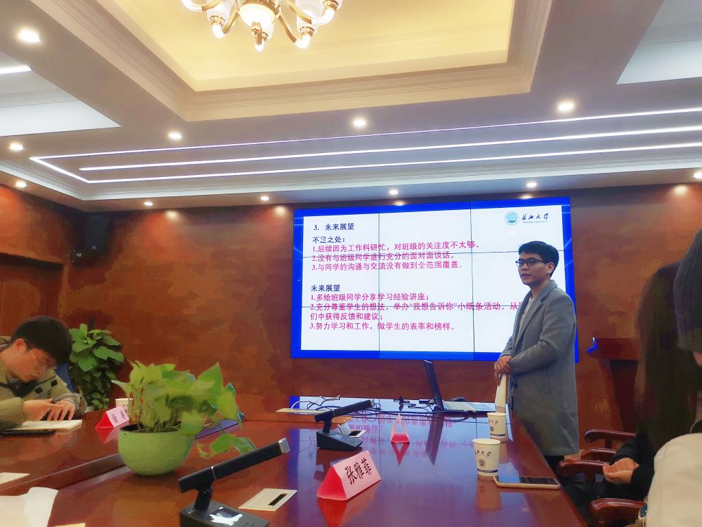 在简短的自我介绍后,地物公司三位嘉宾分别分享自己带班的经验体会,讲述了送诊发热员工、找高年级新疆籍员工帮助新生老乡更好的适应本地气候等问题的事例,及对“班导、班委配合”等方面的思考。随后公司班导依次上台,通过PPT用数据、图文生动展示了新生入学以来的学习、生活情况以及班导们在引领团学工作、班级团建、学风建设等方面的特色方法,包括每天发布“军训日记”、利用班团会为班内同学庆祝生日加强班级凝聚力、用“群作业”功能收集截图保证青年大学习完成率、自编地学知识小测验提高学习积极性、坚持陪伴早晚自习将学风渗透在言行举止中……各种别出心裁的做法让大家在交流中,有了新办法,新收获。分享后班导们就自己工作中的问题,积极提问交流,直到九点半还意犹未尽。