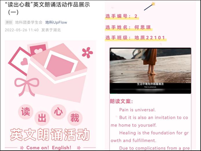 经过30天的大众投票和专业评分,地质22103班徐子淇的《小王子》片段、资工22102班万佳怡的《假如给我三天光明》、地产22001班刘亚唯的《聂鲁达诗歌》、地信22101班李念珊的《完美主义》等近20个作品脱颖而出,获得一等奖、活动还评出二等奖8名、三等奖12名,优秀奖若干,获奖同学将获得荣誉证书与台灯、水杯等奖品。