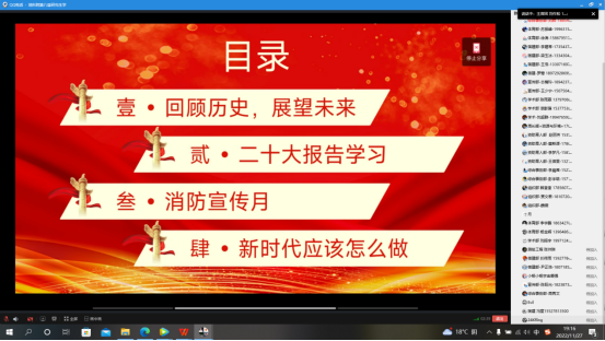 活动开始,由主席刘作松简单介绍了本次活动的主题、目的及流程。活动共分为四个部分。第一部分为回顾历史展望未来;第二部分为二十大报告学习;第三部分为消防宣传月;第四部分为新时代应该怎么做。