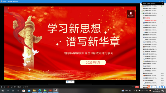 (通讯员付安琪古楠玲)为深入学习贯彻习近平新时代中国特色社会主义思想,进一步增强“四个意识”,坚定“四个自信”,做到“两个维护”,提升公司研究生政治理论素养,深刻认识和准确把握党的二十大重大主题、重大理论观点、重大战略思想。从11月10日至11月30日,公司开展了以班为单位组织学习,线上、线下相结合的政治理论学习活动。并于11月27日晚,集中进行了线上政治理论学习活动,此次政治理学习活动由公司研究生会主席刘作松主持与讲解,部分研究生参加。