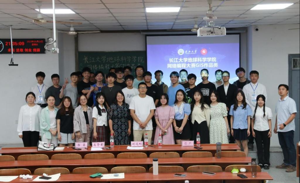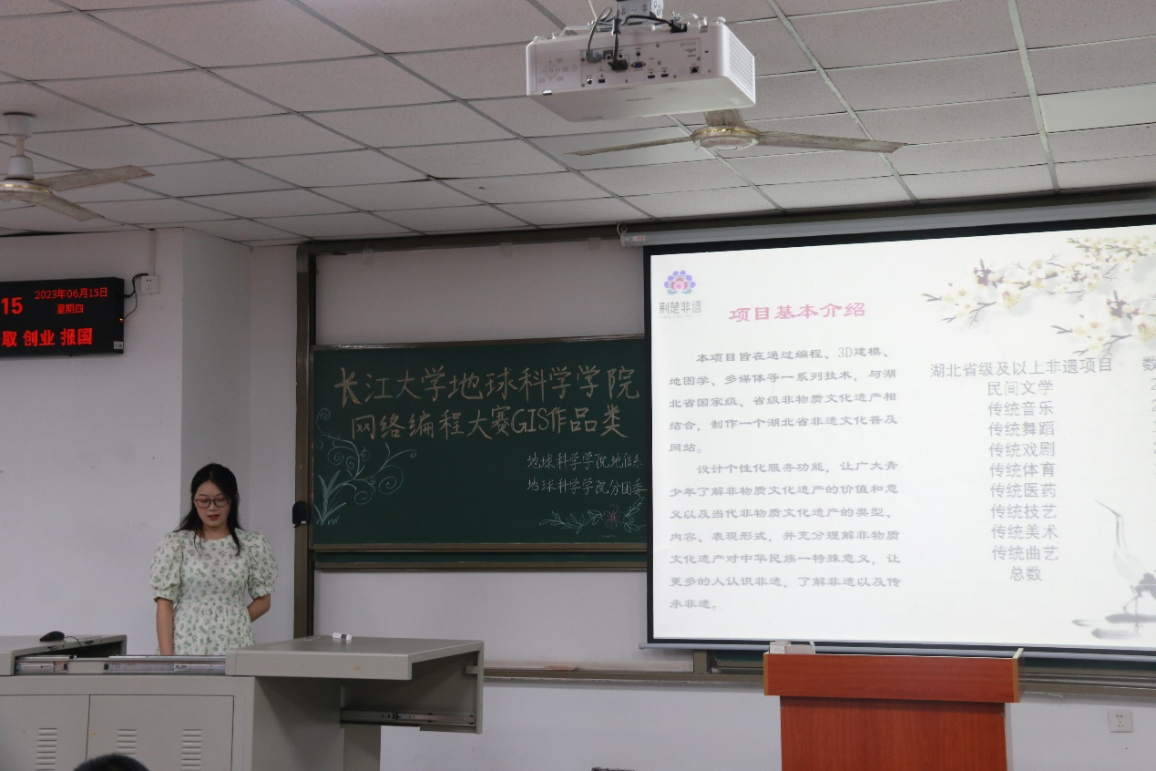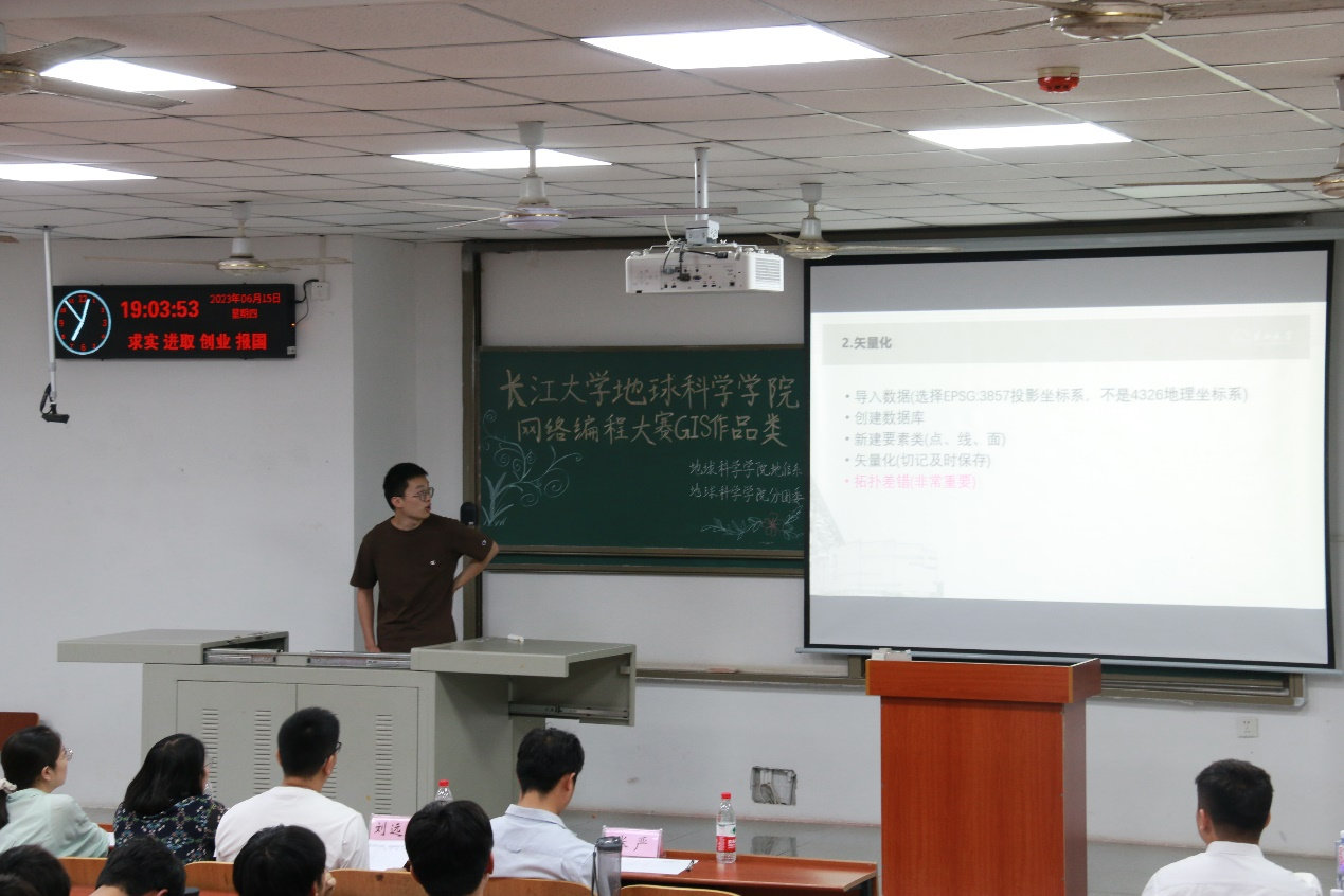 “GIS作品组”分为“程序设计组”和“地图制图组”两类,比赛于6月15日晚7时在武教B104举行。地信系刘远刚副教授和高贤君副教授担任评委,学工办郭霖和张严两位老师参会。